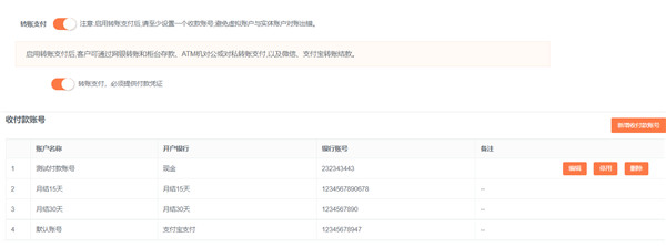 企业将自己的收款信息登记在系统中,客户提交订单后,此时订单状态为待付款状态,客户选择线下支付,选择对应的企业登记的收款信息,然后上传转账截图凭证后,此时订单状态为待确认状态,企业可以在后端单个或批量确认收款信息。确认后订单为已收款状态。