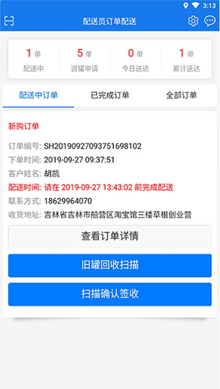 4、旧罐回收业务,只需要选择“旧罐回收扫描”扫描气罐条码即可,完成订单后,选择确认签收即可