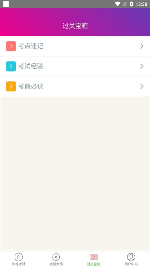 5、进入过关宝箱,这里有系统给大家准备的考点速记、考试经验和考前必读;