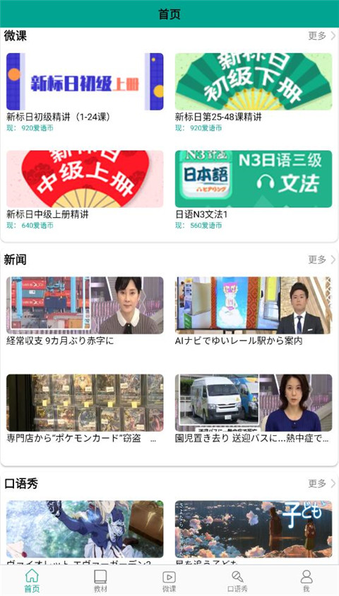 1、打开软件,可以看到有日语微课、新闻和口语秀等,可以帮助更好的进行日语训练