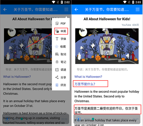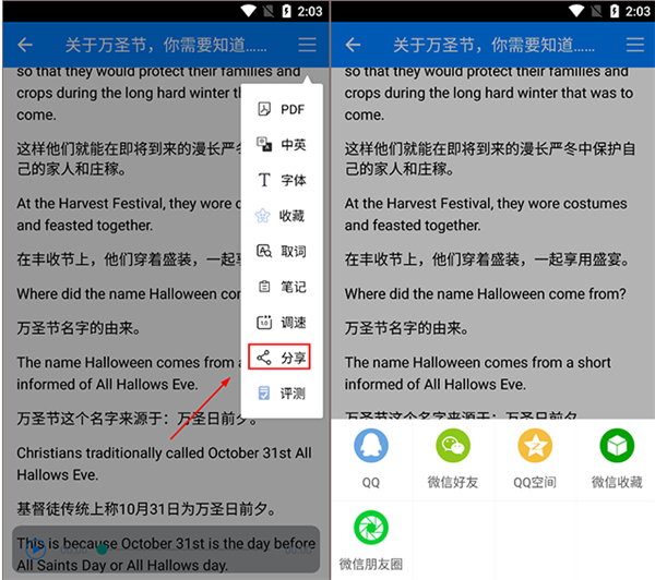 3、按住屏幕选择文章内容,然后查看英语的发音还有含义。1、5秒算出你的兴趣