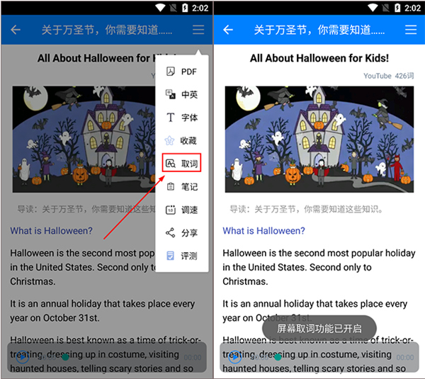 2、提取文章中的内容,使用取词功能就能从文章中提取相应的字词内容;