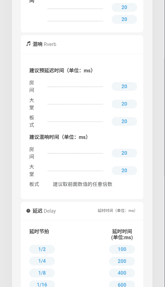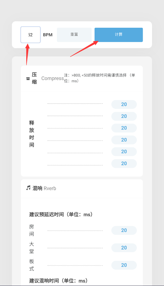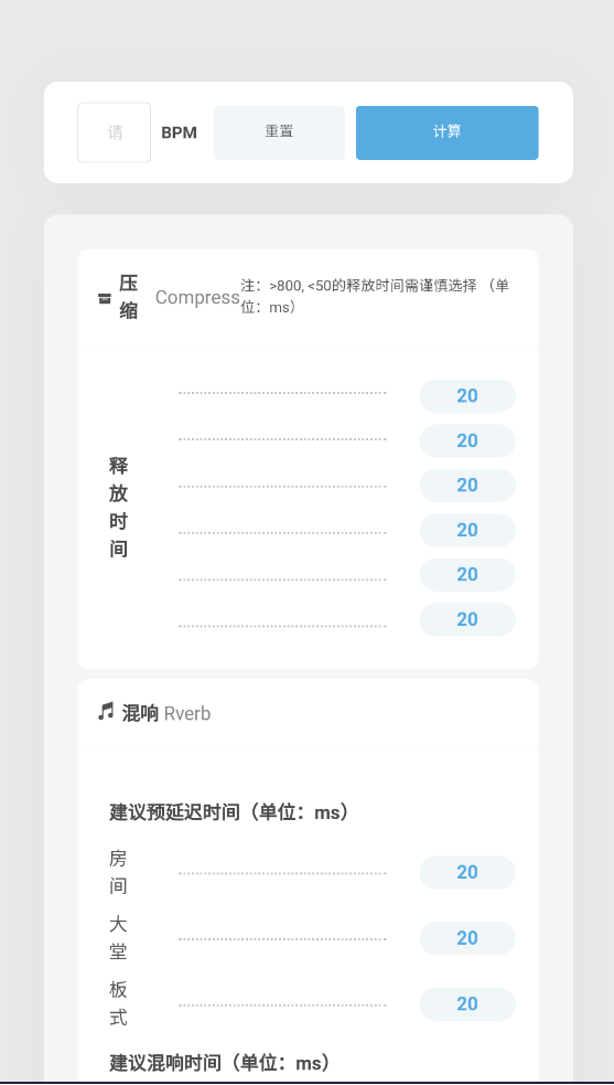这款混音助手app由音律屋开发,主要帮助音乐制作人调整压缩、延迟和混响三个关键音频参数。操作很简单,用户输入歌曲的BPM(每分钟节拍数)后,软件会自动计算出释放时间、预设延迟时间和建议混响时间,方便用户选择适合的数值进行混音。