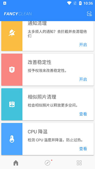 1、下载本站提供的极光清理软件安卓版,进入首页之后可以看到拥有CPU降温、改善稳定性、通知清理等功能;
