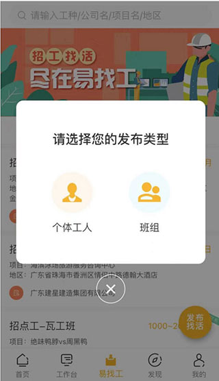 2、点击“发布找活”可以选择以工人身份或班组身份发布找活信息