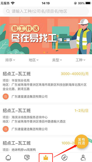 1、先从本站下载好工匠易APP,然后打开注册账号,点击底部“易找工”模块,看到发布找活按钮