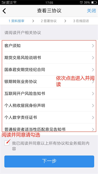 11、进入“查看三协议”页面。阅读所有协议后(需每份协议单独点开并阅读完整才可以进入下一步),勾选“我已阅读并同意以上协议”,并点击“下一步”按钮。