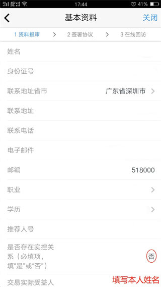 6、进入“基本资料”页面。正常情况下“客户姓名”、“身份证号”会自动读取,请核对此信息是否正确,不符可进行修改。完善本页面所要求填写的信息。“是否存在实控关系”项,填写“否”;“交易实际受益人”,填写“本人”。点击“下一步”按钮。