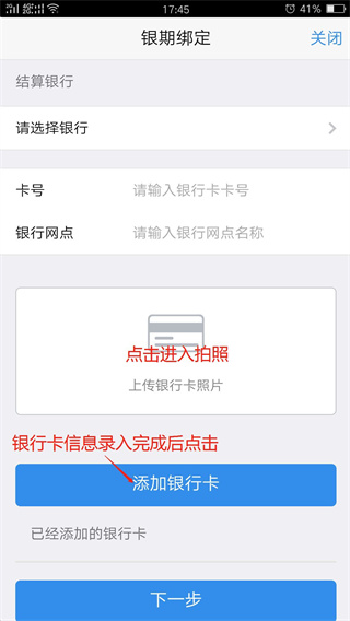 7、进入“银期绑定”页面,选择结算银行,输入银行卡账号和网点信息,上传银行卡正面清晰照(拍摄前可垫一张白纸并在银行卡下方抄下银行卡号),点击“添加银行卡”按钮。添加银行卡完毕后,点击“下一步”按钮。