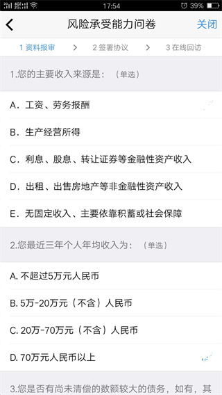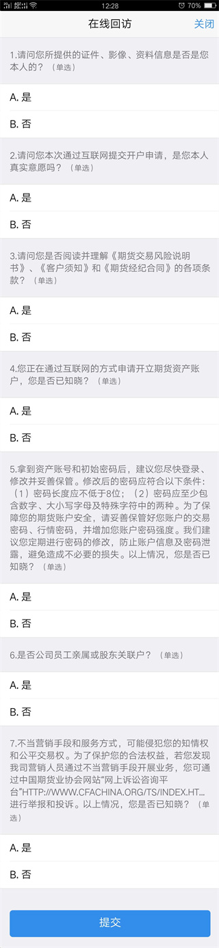 9、进入“适当性调查风险承受能力问卷”页面。请根据实际情况进行选择,全部完成后点击“提交”按钮。提交后会有弹窗提示,告知您的评分以及风险等级,符合点击“继续开户”,不符合则可点击“重新测评”重做。