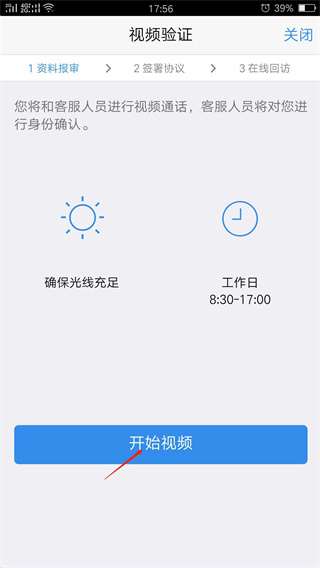 12、进入“视频验证”页面,点击“开始视频”按钮,接着点击立即接通。根据视频工作人员的指令完成验证。(视频验证环节可能需要排队等候)。视频验证通过后,点击“下一步”按钮(若视频验证不通过,系统会自动回到相应页面,修改信息完毕后可继续进行开户步骤)。