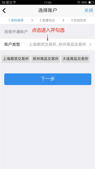 10、进入“选择账户”页面。点击“账户类型”,选择所要申请的交易编码(初次开立期货请只选择“上海”“郑州”“大连”三个交易所,其余交易所均不选择),选择完毕后,点击“完成”和“下一步”按钮。