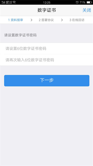 13、进入“数字证书”页面,输入并确认6位数字证书密码(自行记住密码),安装数字证书后,点击“下一步”按钮。
