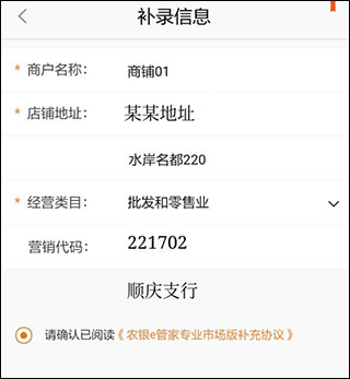 5、补录相关信息——商户名称(一般为简称,不能有“有限公司”等出现,没得招牌的,可以叫“个体户**”);地址;经营类目下拉选择。