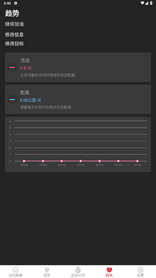 5、点击屏幕下方趋势按钮,即可进入运动趋势页面,在这个页面会记录你最近的运动概况,并且会记录成运动趋势图。