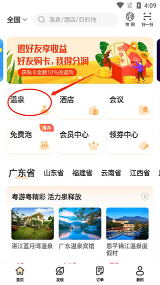 2、接着选择预定地区,在搜索栏搜索温泉名;