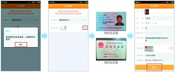 用户首次登录安易递用户版APP,需要先完成实名认证。选择所在地区(默认当前地市),扫描身份证正反面。完成实名认证后,用户就可以使用了。