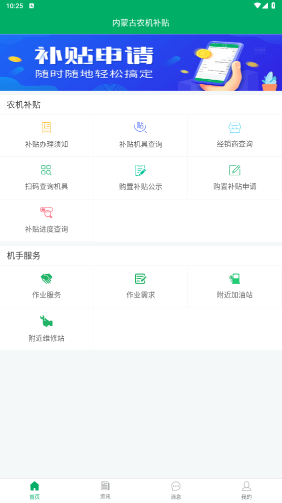 1、下载安装内蒙古农机补贴app并进行注册登录,选择购置补贴申请;