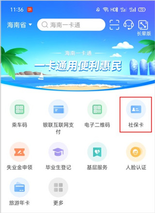 1、进入海南一卡通软件主页面-社保卡-“社会保障卡”。