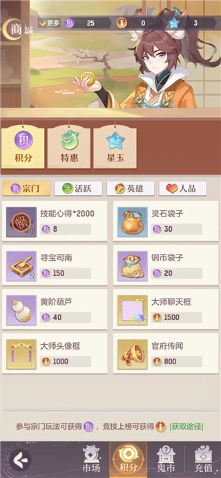 其次是灵师和角色培养,灵师的装备和灵石镶嵌需要拉满(红色装备+2级宝石),用铜币就可以搞定。人物角色则需要打造一身红装并配上3级宝石,这里需要则花费一些元宝,做完日常后的元宝够用,并且绑玉可以在坊市里买礼包,可以获得大量元宝跟铜币。
