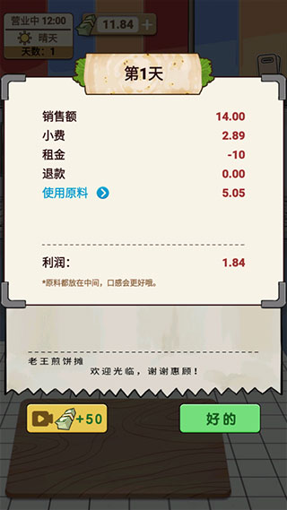 煎饼果子游戏也很注重细节,不仅房租、食材、小费、退款等每一天都会有一个结算,让玩家可以清楚看到自己的盈利,而且游戏内每天的利润都不一定是赚钱,因为客人也会退款,当我们放多其他的食材也是会扣费的,非常真实!很推荐大家试试哦!
