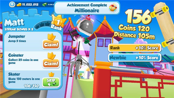 4、人物等级和滑板都可以加成分数,所以在游戏中一定要注意收集到金币,有了足够的金币就可以去购买滑板和道具啦。