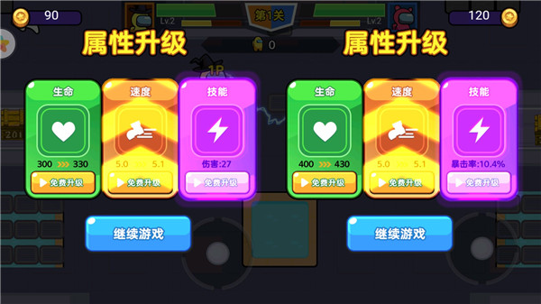 7、每当完成一小关卡时,你可以对生命、速度、技能等属性进行升级,获得更加强大的实力;