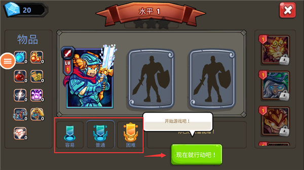 3、之后我们需要选择英雄,可选择3个进入,同时在旁边还有着物品栏;