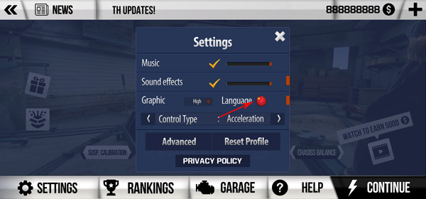 另外,作为一款赛车竞速游戏必不可少改造系统,没错,在这里同样拥有着强大的改造功能,玩家们可以在这里给自己喜欢的越野车进行改造,从外观到内部零件、引擎都支持改造,让你轻松打造属于你个人特色的越野车,这样不仅可以提升你的越野车颜值,还可以增强各方面的性能属性。此外,游戏中还有着大量的任务供玩家挑战,完成相应的任务还可以领取丰厚的游戏奖励,对此感兴趣的小伙伴可以来本站下载体验。在设置中选择中国国旗,之后重启游戏即可切换为中文。