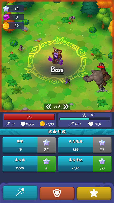 作为法师职业,你需要保护自己的塔不被怪物摧毁。击败敌人会得到星星,用来强化塔的属性。每10关还会遇到BOSS战,击败后能获得大量奖励。任务和成就也能解锁宝石和金币,用来抽卡或升级。
