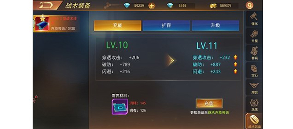1、使用充能模块强化,可以增加战术装备的基础属性值。