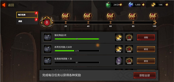 3、许多不同的任务等待你的挑战,尽可能多的获得奖励,因为不管是装备还是符文都需要大量的金钱,虽然不用氪金了,但是时间还是需要付出一些的
