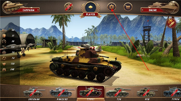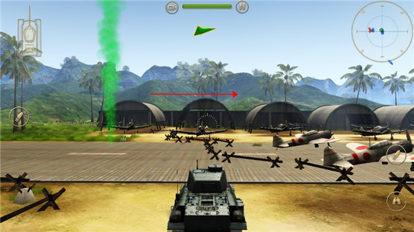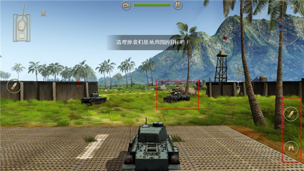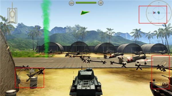 1、玩家在游戏中通过左屏幕的虚拟摇杆来控制坦克的前进后退,这里要注意的是,坦克的行动与坦克自身的能力数值以及地形有着非常密切的关系,坦克在转向、后退时都相应会有一定的黏滞。坦克在行动的过程可以进行射击,但精度较低,玩家可以通过右边的按键进入瞄准模式,通过在屏幕上滑动来瞄准。