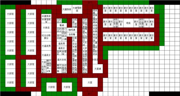 这是全部开拓完毕后的最终布局,相性最大化,红格子是路,绿格子是绿化。更衣室上下两部分一样,用到一个部分柜子就够了。