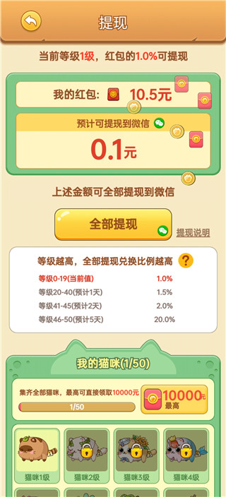 3、还有每天不断的合成猫咪提升等级也可以获得红包