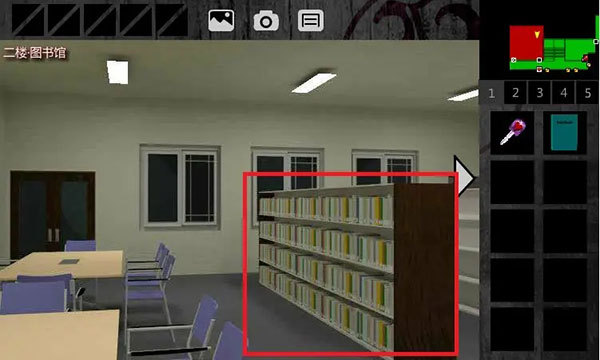 6、右转,靠近前方的书柜,发现一排绿色书,也有一些图案(随机),然后点击开始解谜。