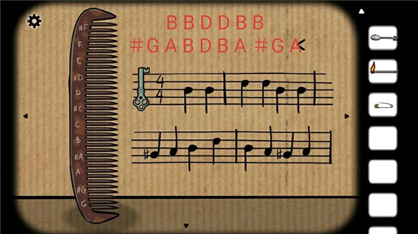5、将最后一个碎片放在纸壁上获得提示「B B D D B B #G A B D B A #G A」,点击梳子,输入纸条上的音符获得「钥匙」;