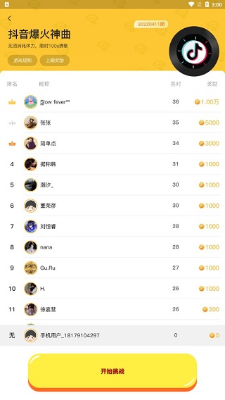 如“抖音爆火”神曲,点击进去,开始挑战!