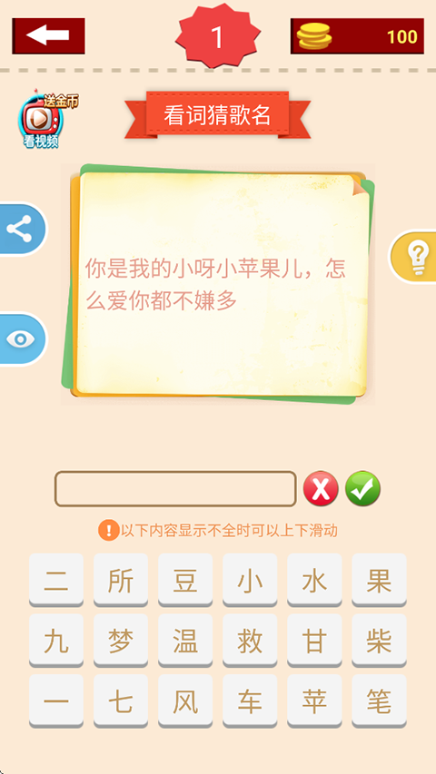 5、【歌词模式】:根据歌词猜出歌名,每过一关奖励100金币,游戏中每隔10分钟奖励100金币,回答错误一次扣除50金币。