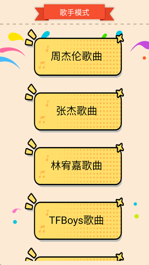 6、【歌手模式】:进入歌手模式之后,我们猜歌的曲库都会从该歌手的作品中进行随机选择,目前支持的歌手有周杰伦、张杰、林宥嘉、TFBoys、薛之谦、Beyond、邓紫棋等。