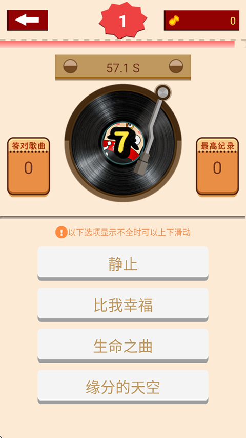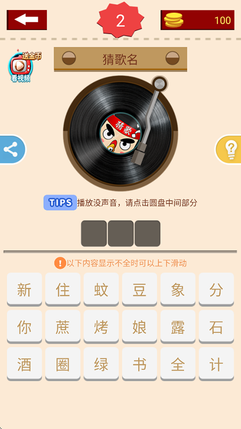 2、【闯关模式】:根据歌曲猜出歌名,每过一关奖励100金币,游戏中每隔10分钟奖励100金币,回答错误一次扣除50金币。