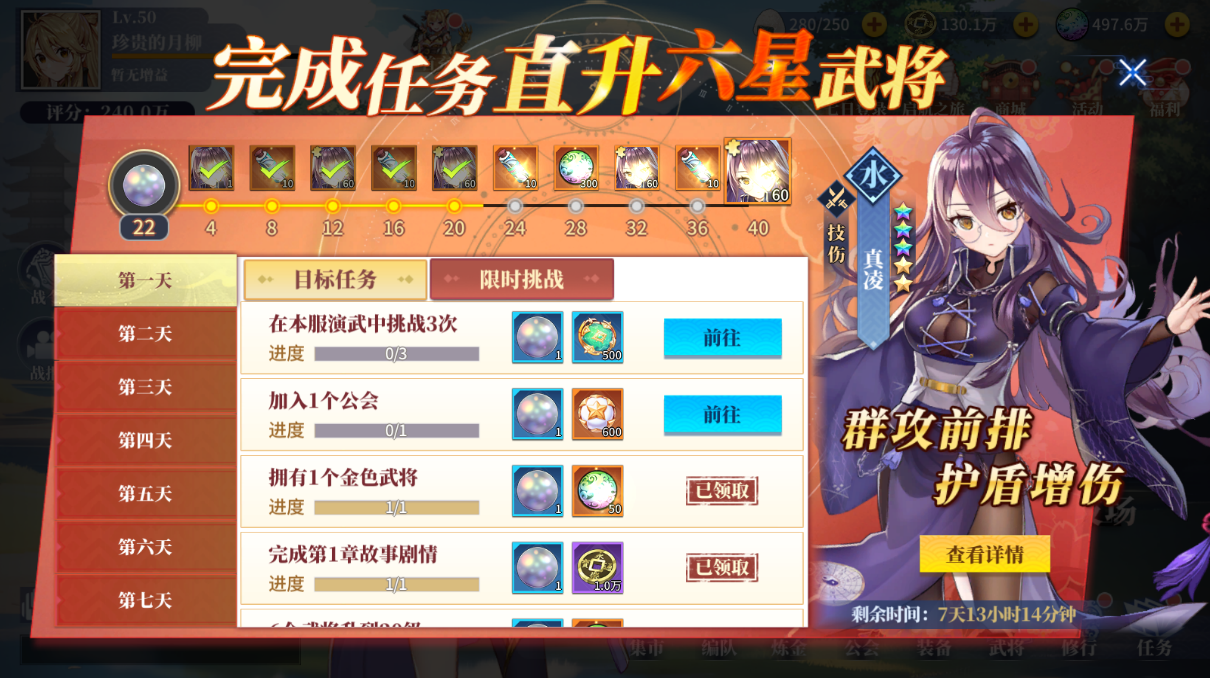 记得领取章节奖励,去【召唤】进行10连抽,抽到什么用什么就行,快速提升人物等级。同时开启了(起航之旅)玩法,小伙伴们需要每日完成起航之旅内的任务来获得武将碎片迅速提升武将的星级。