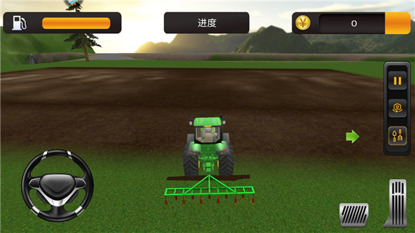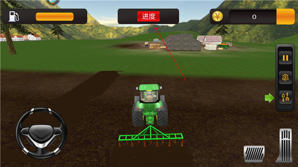 3、安装好后,根据箭头来到田边,行驶时按住右边的图标开始耕地。