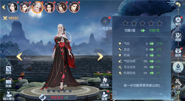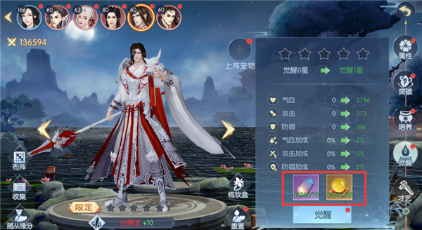 觉醒功能在主角46级时解锁。在达到等级后,单个角色首次觉醒还需要达到突破5,并且需要准备足量的突破石、觉醒丹。后续觉醒,也依旧需要优先提升突破等级,以及随时准备好足够的觉醒材料哦。觉醒提升属性的效果非常明显,主要是以固定值、百分比两种方式来提升海量气血、攻击、防御属性的。其中固定值是直接获得对应属性的数值,百分比加成则是基于角色自身基础成长属性,不受突破、培养、装备、宝石等其他额外附加属性的影响。每个随从觉醒最高星级为10星,觉醒数值提升幅度:蓝色随从<紫色随从<橙色随从=主角<红色随从
