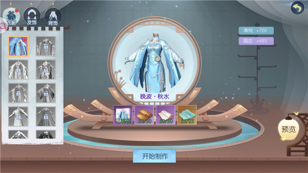 进入“时装”界面,选择发髻、服饰、配饰,自由搭配并预览各时装效果。进入左下角“制衣”系统,可查看并制作全新时装。