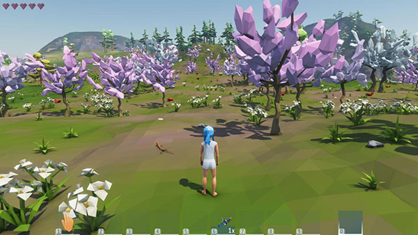 2、而在屏幕的左上角的小红心就是玩家的血量,总共5个血,当没有装备面对一只狼豹等肉食生物的攻击时,血量会迅速下降,所以前期要避开主动进攻的生物。艾兰岛添加了温度、饱食度等设定。这也就意味着当人物饥饿、寒冷时会持续缓慢掉血,总而言之,生存环境不合适的话,掉血是比较迅速的,所以玩家要尽快给自己组建起一个可以生存的空间。