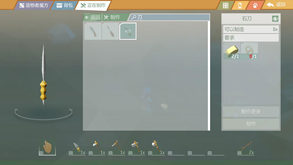 制作完简单的“草绳”,返回上一级界面,加上1块燧石就可以轻松制作出一把石刀啦!怎么样?是不是非常简单呢?通过上述示例,小伙伴们不妨大开脑洞举一反三,继续拾取地面上的“木棍”、“石头”,继续合成其他工具。