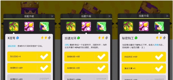 弓箭女皇:第一个技能是“X连弩”,作用是在4秒内同时攻击两个目标。第二个技能是“加速光环“,作用是每六秒生成一个”加速光环“。第三个技能是”秘密特工“,作用是当生命值较低时进入隐身状态,与部落冲突中女皇的大招一样。