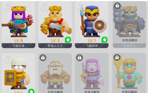 游戏内目前有8个英雄,分别为野蛮人之王、弓箭女皇、飞盾战神、圣盾少女、盖世武僧、吸血伯爵、骷髅帝王、海洋领主。