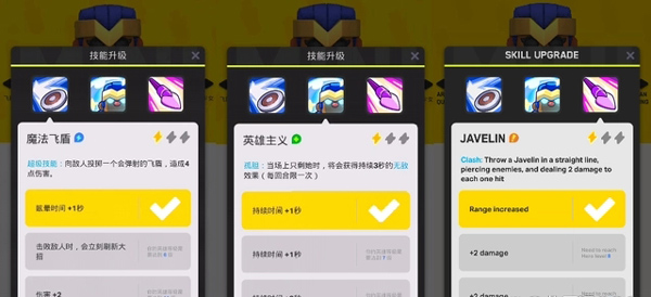“盾王”一技能是扔出盾牌,造成一点伤害和2秒眩晕,三级时可以造成3点伤害;二技能是当只剩下自己时处于无敌状态3秒,满级时持续7秒;三技能是在一条直线上扔出长矛,穿透敌人,最多可造成6点的伤害。